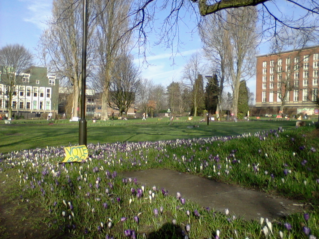 Election fever has hit campus although it made me wonder about some of the motifs being used by candidates, I mean is a panda being equated with democracy really appropriate, even if it does rhyme with your name, and how about the female candidate who uses a logo akin to Easyjet's (maybe understanding the signficance of that one is somethng age related or maybe not when "PanAm" has been broadcasting?!)? The campaign that cites gender discrimination and violence stats is hard hitting but doesn't play well with the administration when open days are beign run simultaneously. And through it all the campus looks lovely as bulbs are starting to erupt.